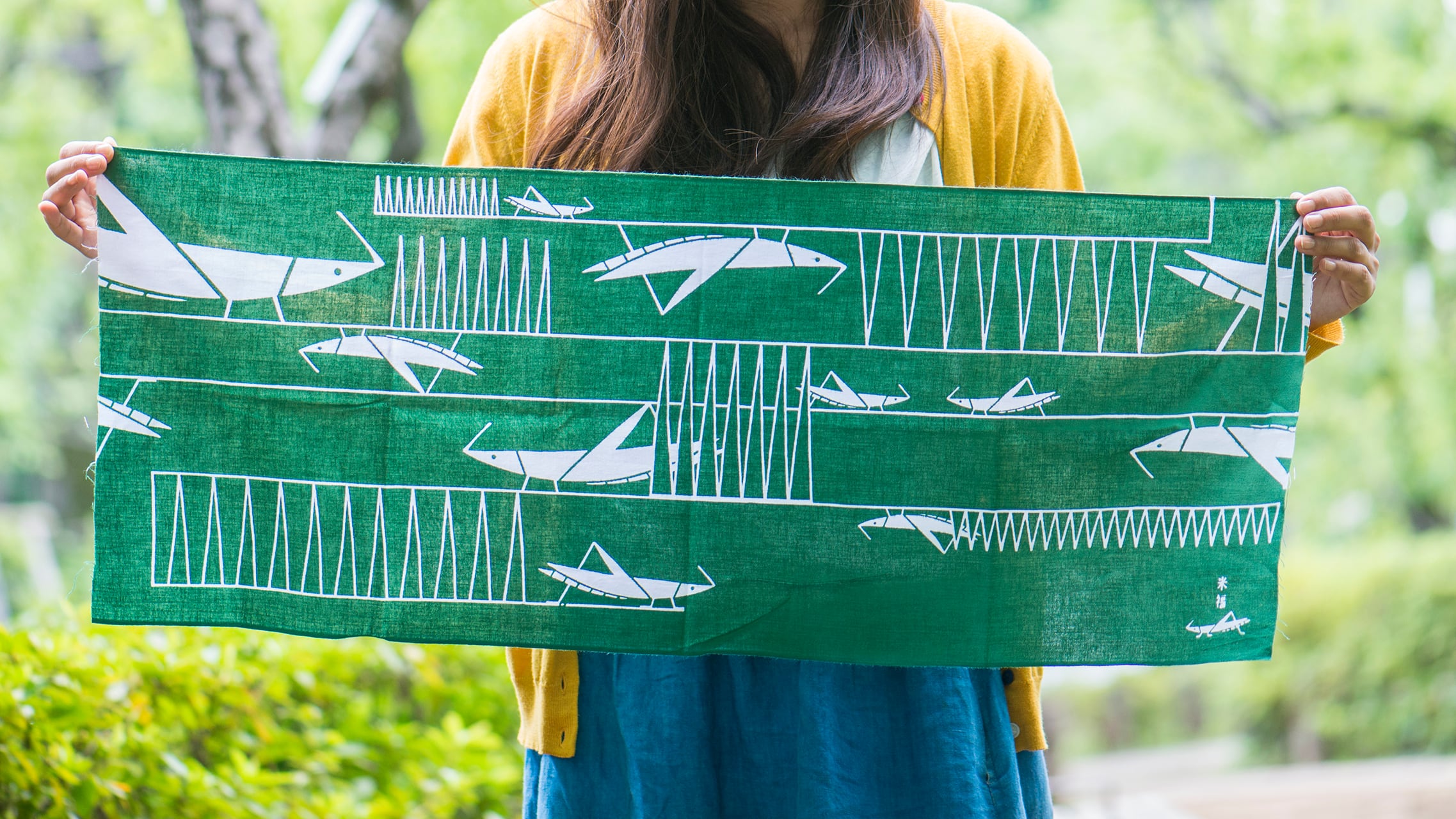 落ち着いた深い緑でつくりました。たたみ方によっていろいろなバッタ柄がたのしめます。